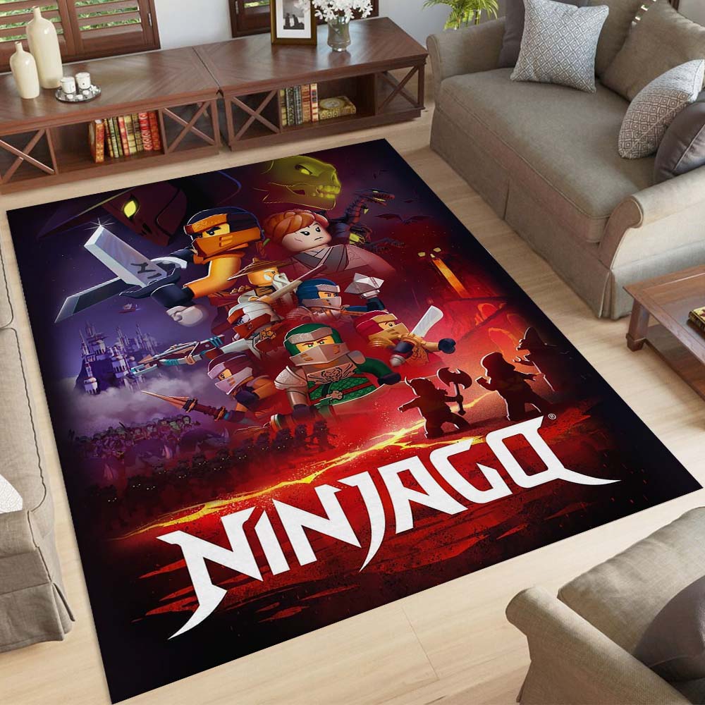 Am unteren Rand des Teppichs befindet sich das große, markante „NINJAGO“-Logo in weißen Buchstaben auf rotem Hintergrund – ein letzter beeindruckender Akzent, der das Gesamtbild perfekt abrundet.
