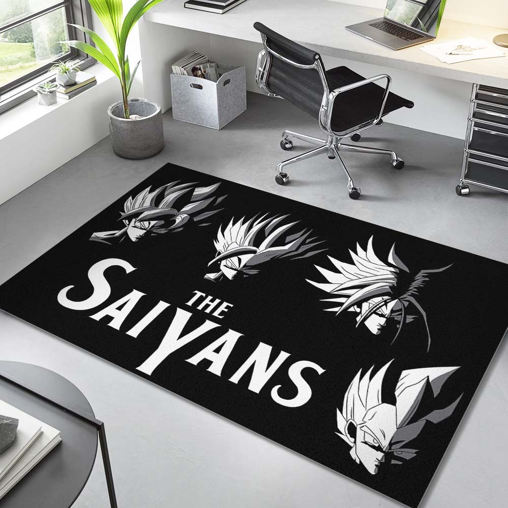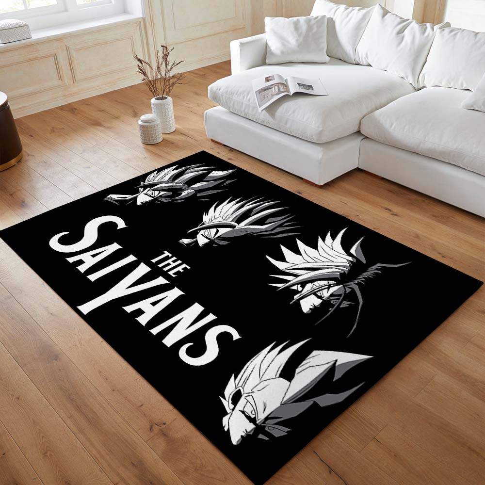 Im Zentrum des Teppichs ist der Schriftzug „THE SAIYANS“ fett gedruckt, eine stolze Bekundung der Stärke und Ehre des Saiyajin-Volkes. Das Wort „THE“ ist kleiner gestaltet, um einen eleganten visuellen Fokus zu schaffen, der das Auge sanft führt.