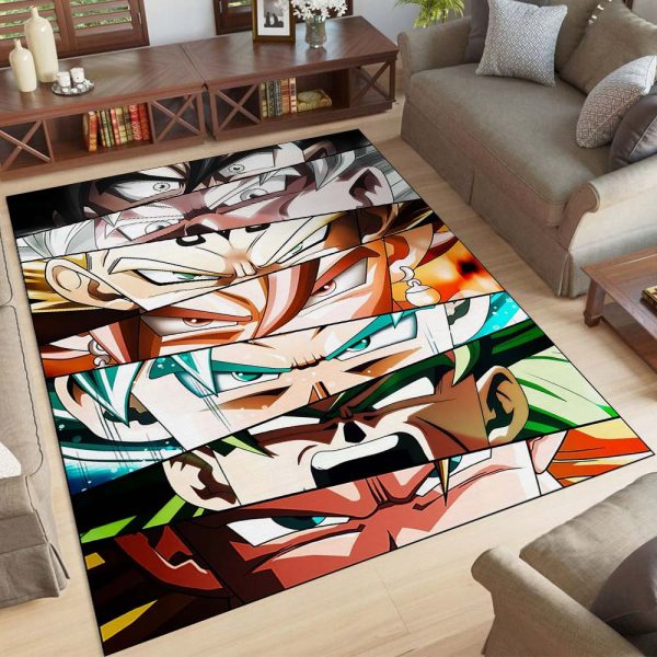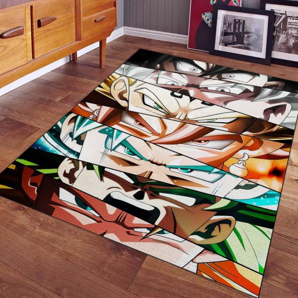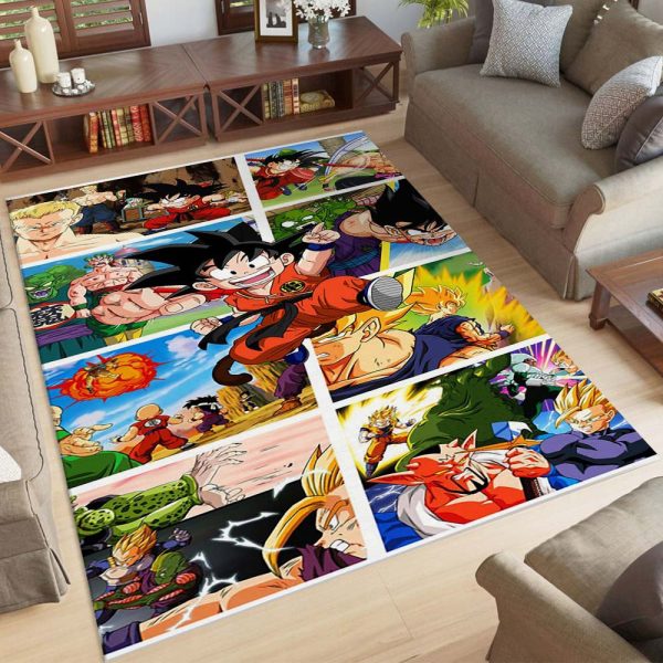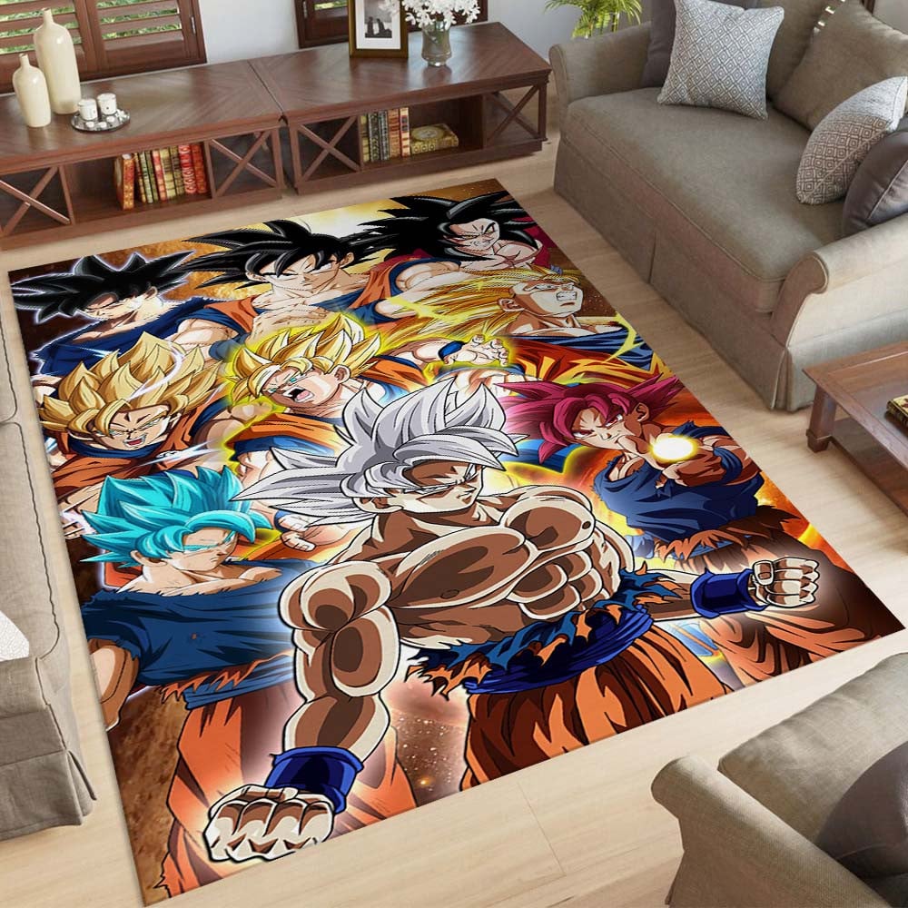 Der Teppich besticht durch ein lebendiges und farbenfrohes Design mit Charakteren aus Dragon Ball Z. Im Mittelpunkt steht die Hauptfigur Goku in verschiedenen Transformationsformen. Die Details sind hochauflösend, und die Farben sind lebendig, was jeden Raum zum Leben erweckt.