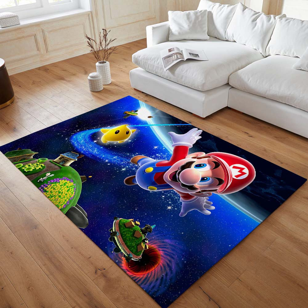 Nebenfigur Luma: Neben Mario ist Luma, ein kleiner gelber Stern, der auf dem Teppich sehr süß und auffällig erscheint. Die Anwesenheit von Luma macht das Design noch interessanter.